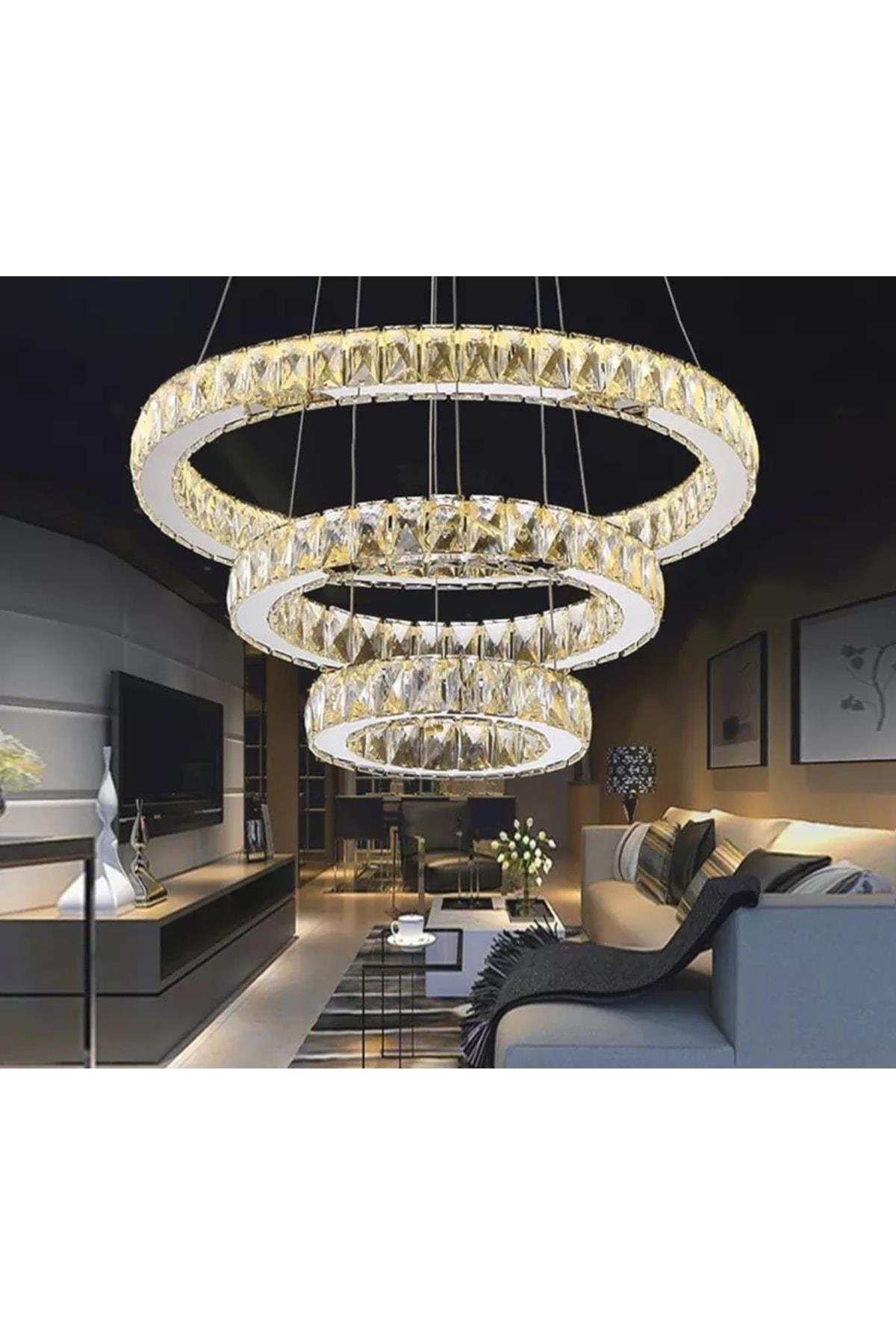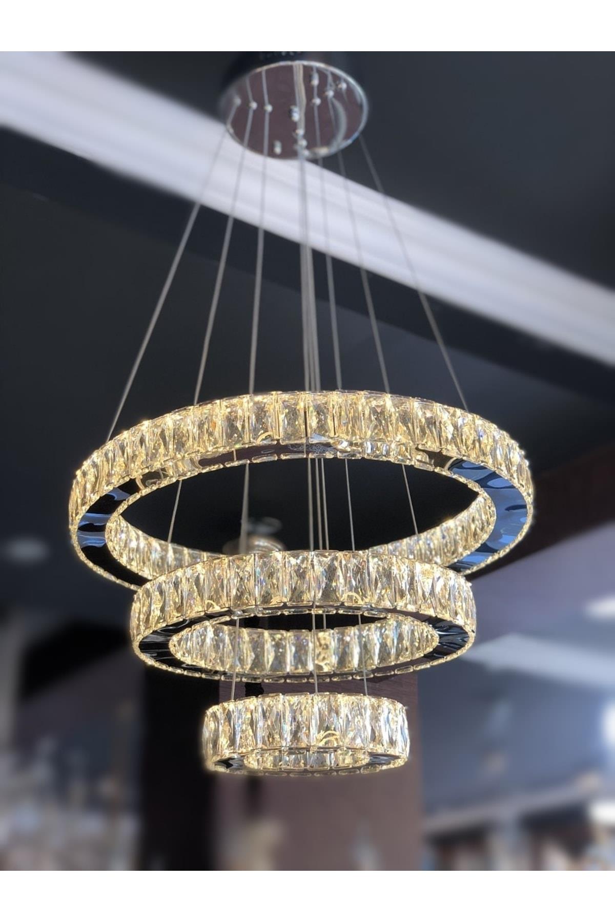 A+ Modern Sarkıt Üçlü Kristal Taşlı Power Led Avize Kademeli 3 Renk Kumandalı Krom
