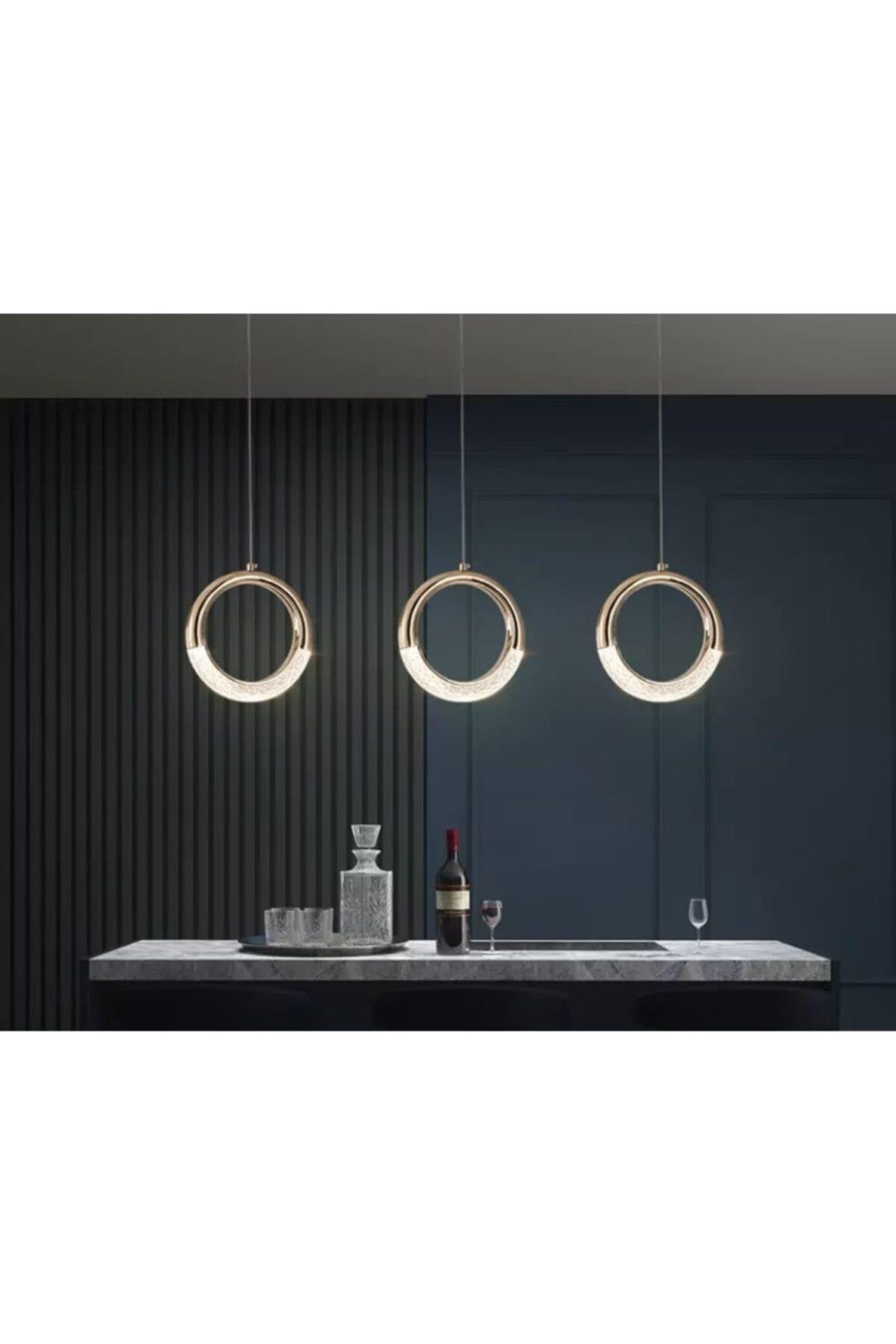 Elegance Luxury Modern Tasarım Üçlü Sarkıt Led Avize Sıralı Yemek Masası Gold Sarı