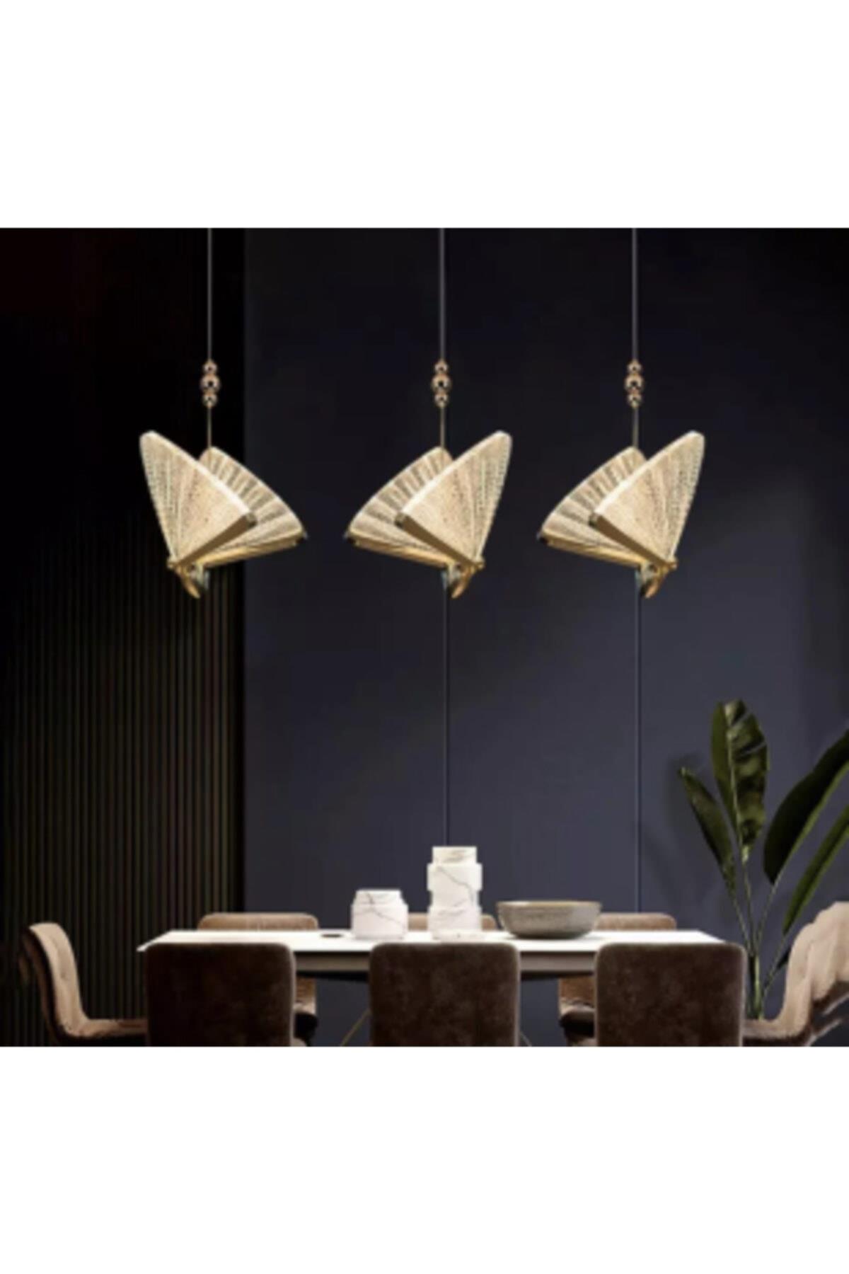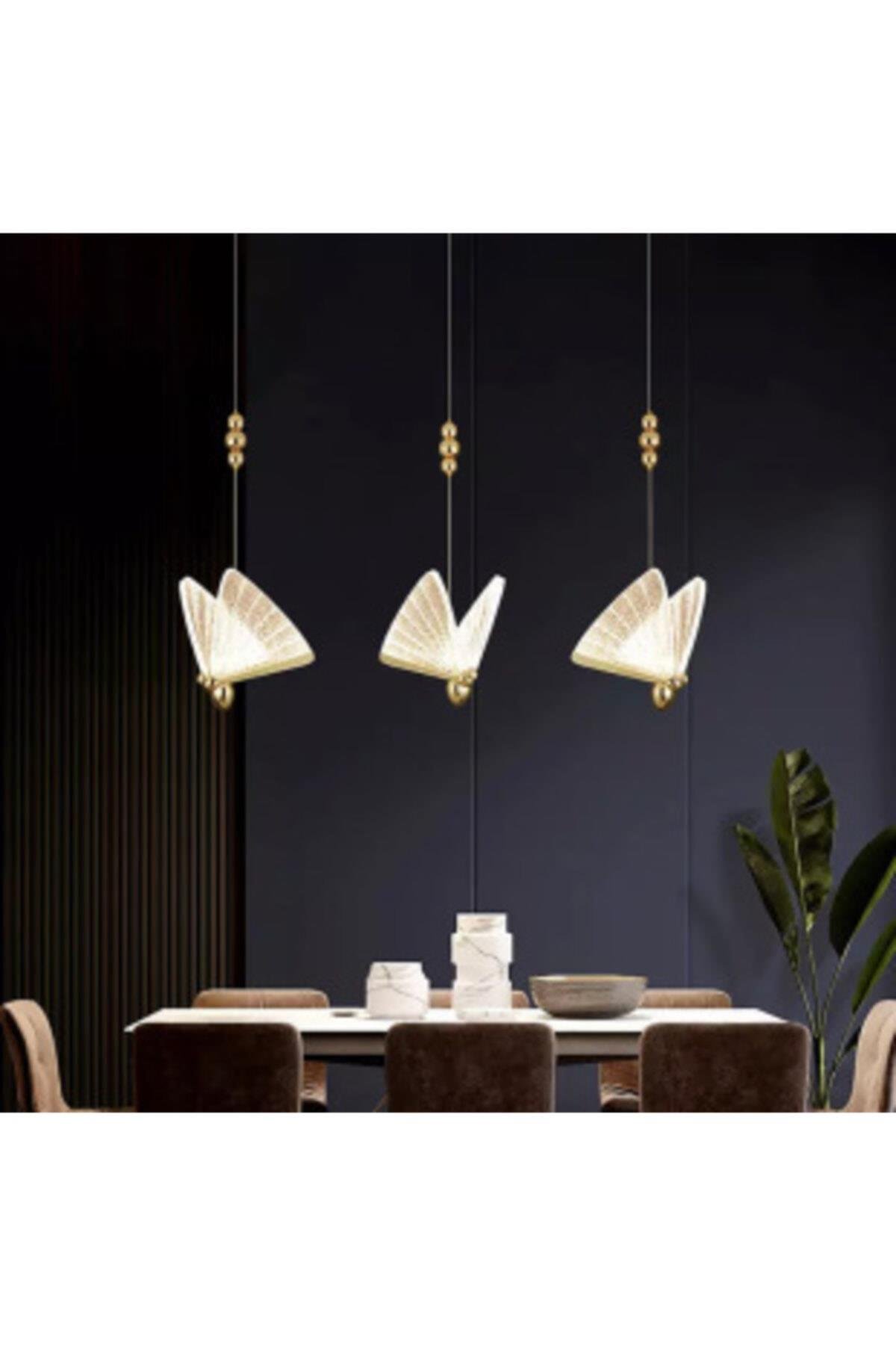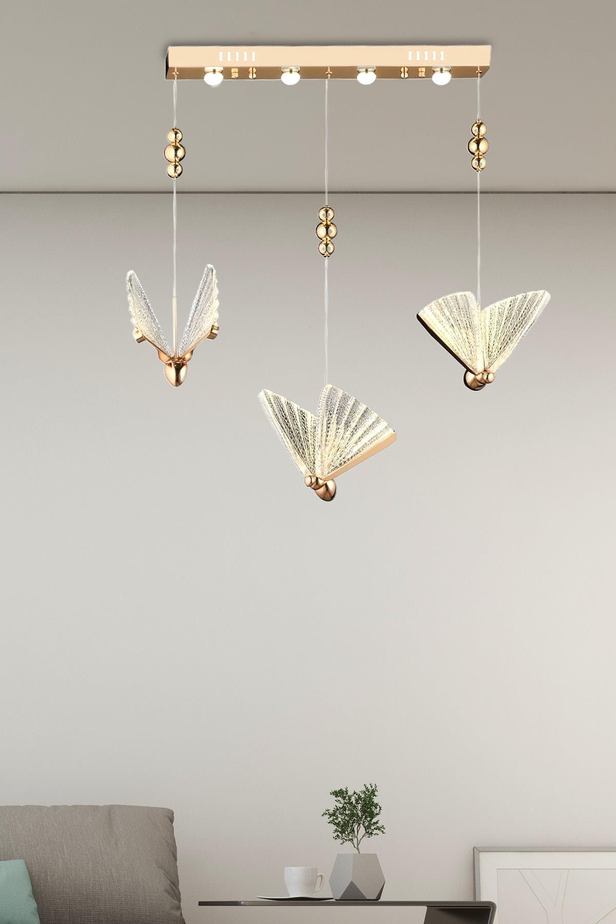 Elegance Modern Kelebek Tasarım Üçlü Sarkıt Led Avize Sıralı Yemek Masası Rose Gold Sarı