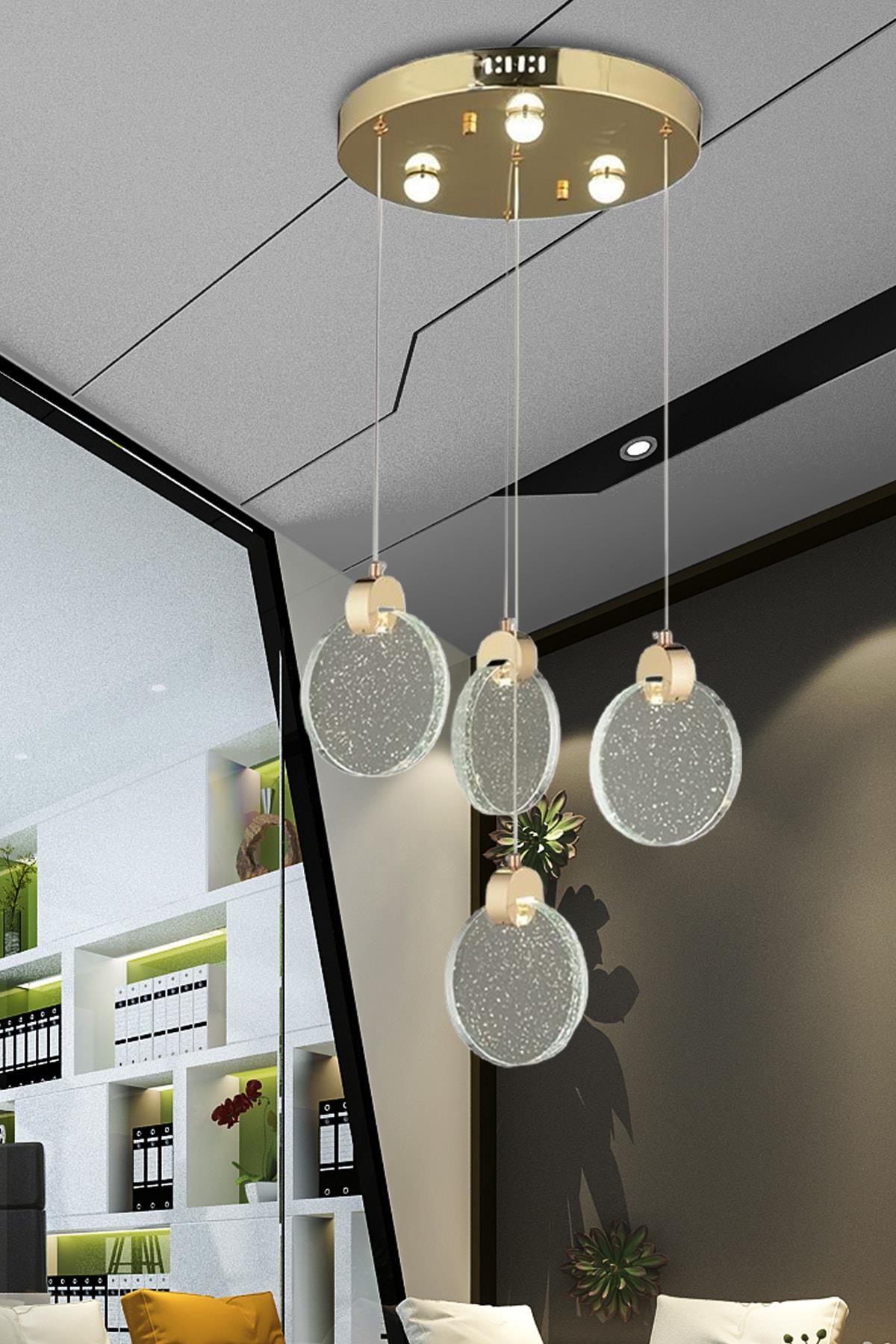 Luxury Modern Sarkıt Dörtlü Power Led Avize Camlı Gold Sarı