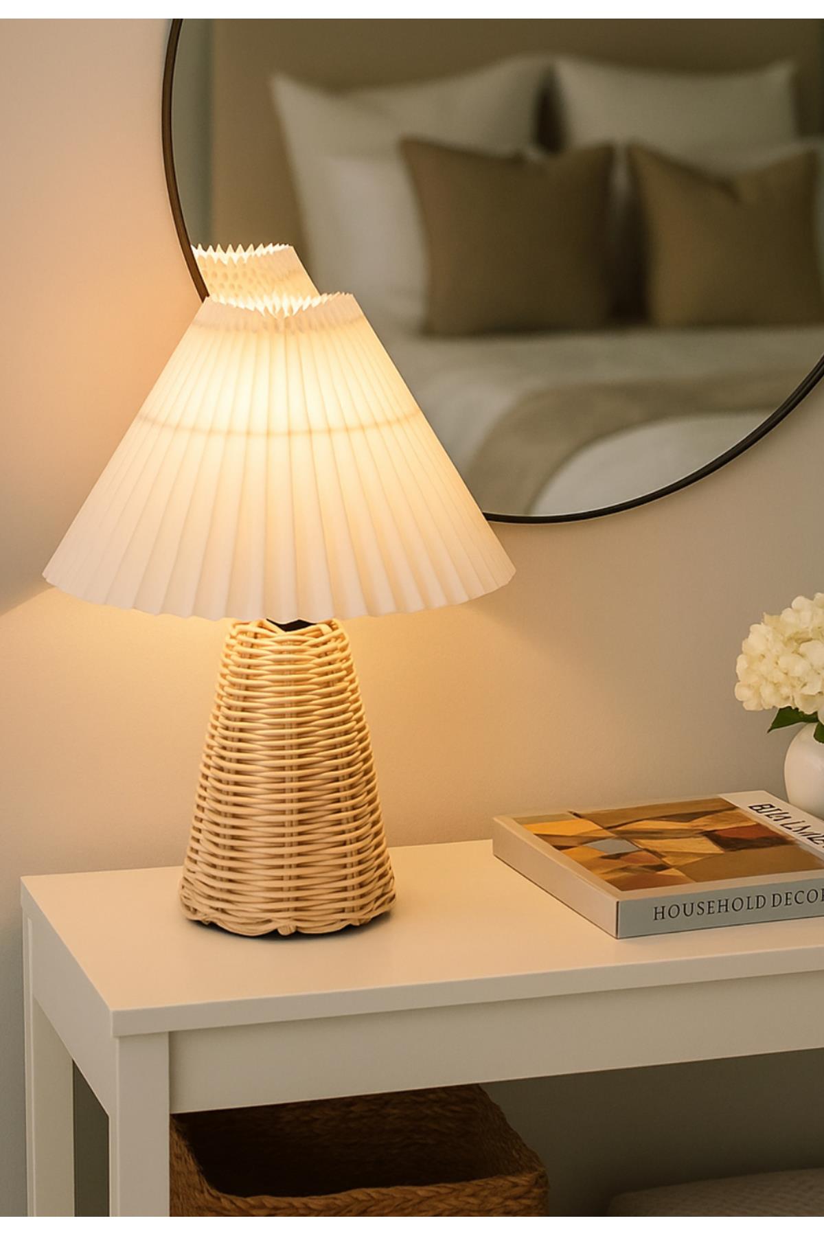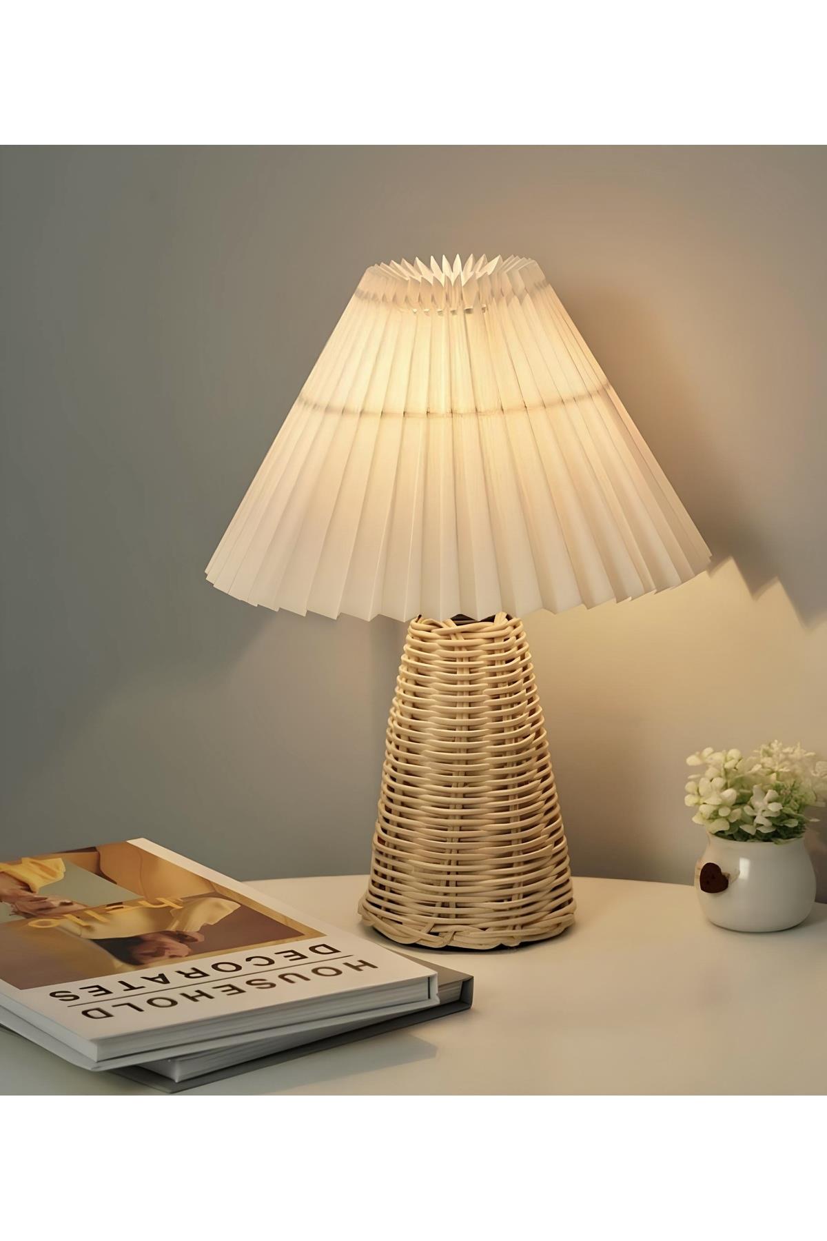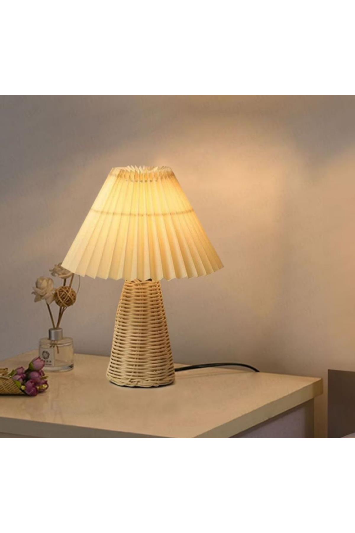 Modern Abajur Premium Krem Kumaş Umbrella Abajur Hasır Bambu Gövde Masa Lambası